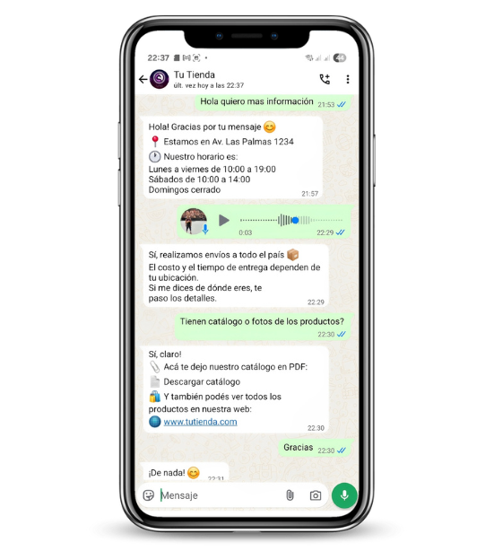 Tu asistente responde 24/7, comparte catálogos, informa horarios, ubicación y mucho más, todo desde WhatsApp o Instagram.